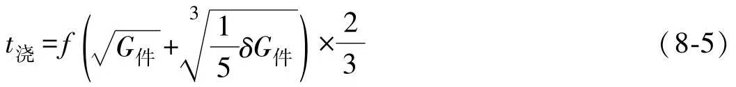 式中,t澆為澆注時(shí)間(s);δ為鑄件的主要壁厚(一般指最薄壁厚)(mm);G件為鑄件凈重總量(不包括澆冒口重)(kg);f為系數(shù),一般取值范圍0.6~0.8。