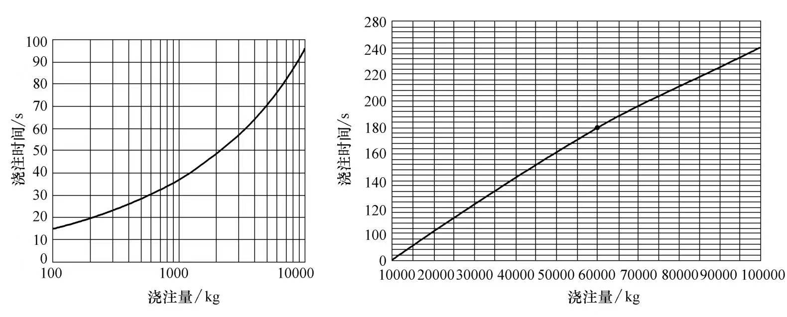 2) 樹(shù)脂砂鑄件澆注時(shí)間可以通過(guò)查圖-3和圖-4的方式確定。