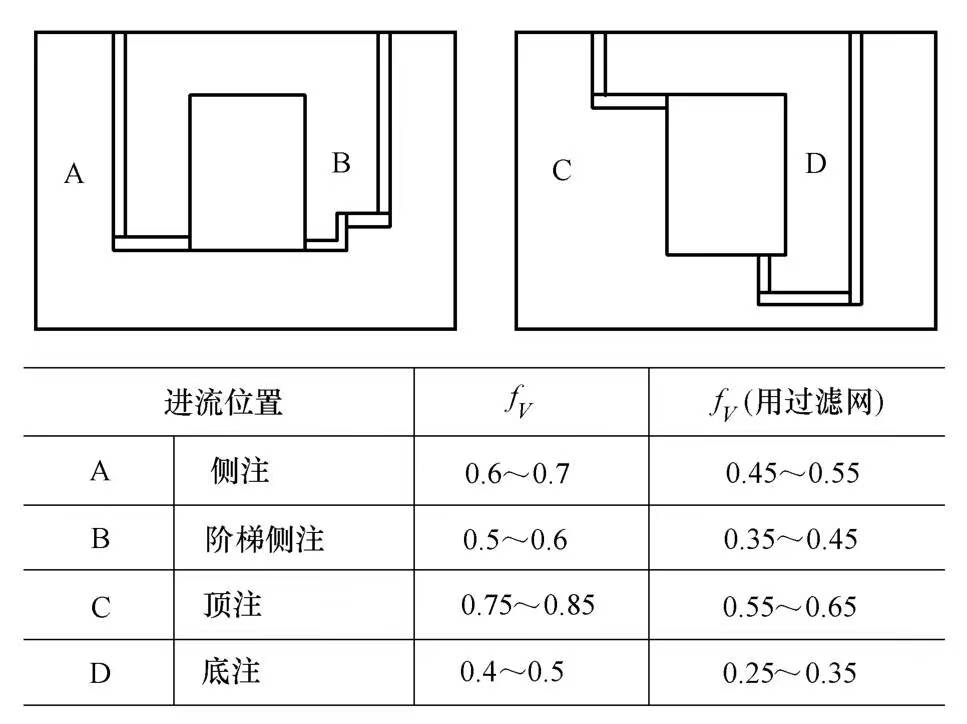 1)根據(jù)進(jìn)流位置和澆注系統(tǒng)結(jié)構(gòu)的不同,速度因數(shù)也不同,具體選擇方式參見(jiàn)圖-5。