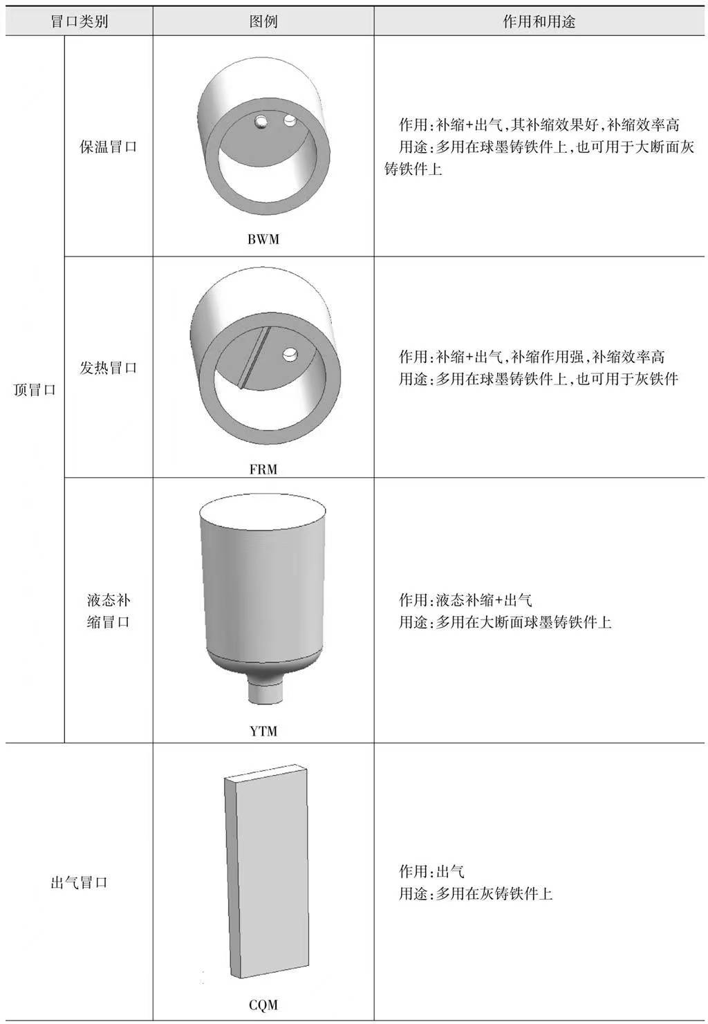 冒口,按照作用可分為補(bǔ)縮冒口和出氣冒口。補(bǔ)縮冒口按照其所在的位置又可分為頂冒口和側(cè)冒口等,出氣冒口一般為扁冒口。球墨鑄鐵件的冒口一般采用補(bǔ)縮冒口,很少采用出氣冒口。表-16冒口分類(lèi)及其作用和用途