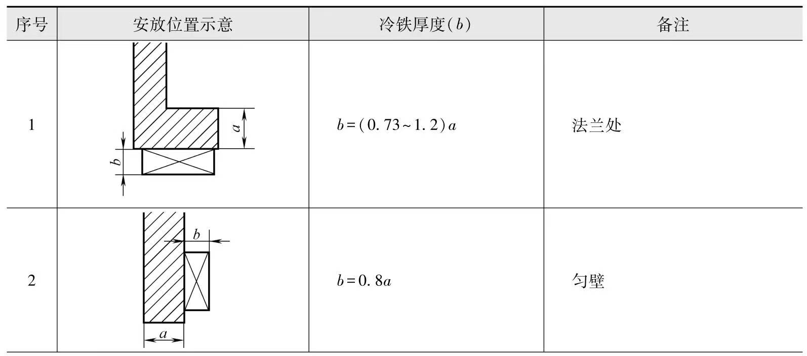 表-17 厚斷面球墨鑄鐵用外冷鐵安放位置和冷鐵厚度