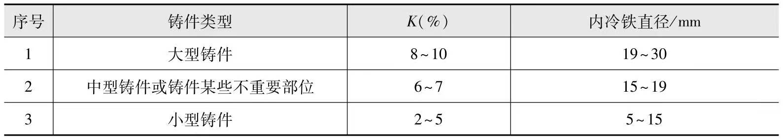 一般內(nèi)冷鐵的材質(zhì)都與鑄件材質(zhì)相同,有利于同鑄件熔合。一般在冒口的補(bǔ)縮能力和外冷鐵的冷卻效果不夠時(shí)才會(huì)采用。最好安放在機(jī)械加工能去掉的地方(如鉆孔處),或用于一些壁厚較大又不太重要的鑄件(如汽錘的鐵砧子、打樁錘、吊錘等)。內(nèi)冷鐵的質(zhì)量一般根據(jù)鑄件的質(zhì)量來(lái)決定,可按如下公式計(jì)算:W=K·G。式中,W為內(nèi)冷鐵的質(zhì)量;G為鑄件的質(zhì)量;K為系數(shù),與鑄件的大小有關(guān),其參考數(shù)值列于表-20。表-19質(zhì)量系數(shù)K