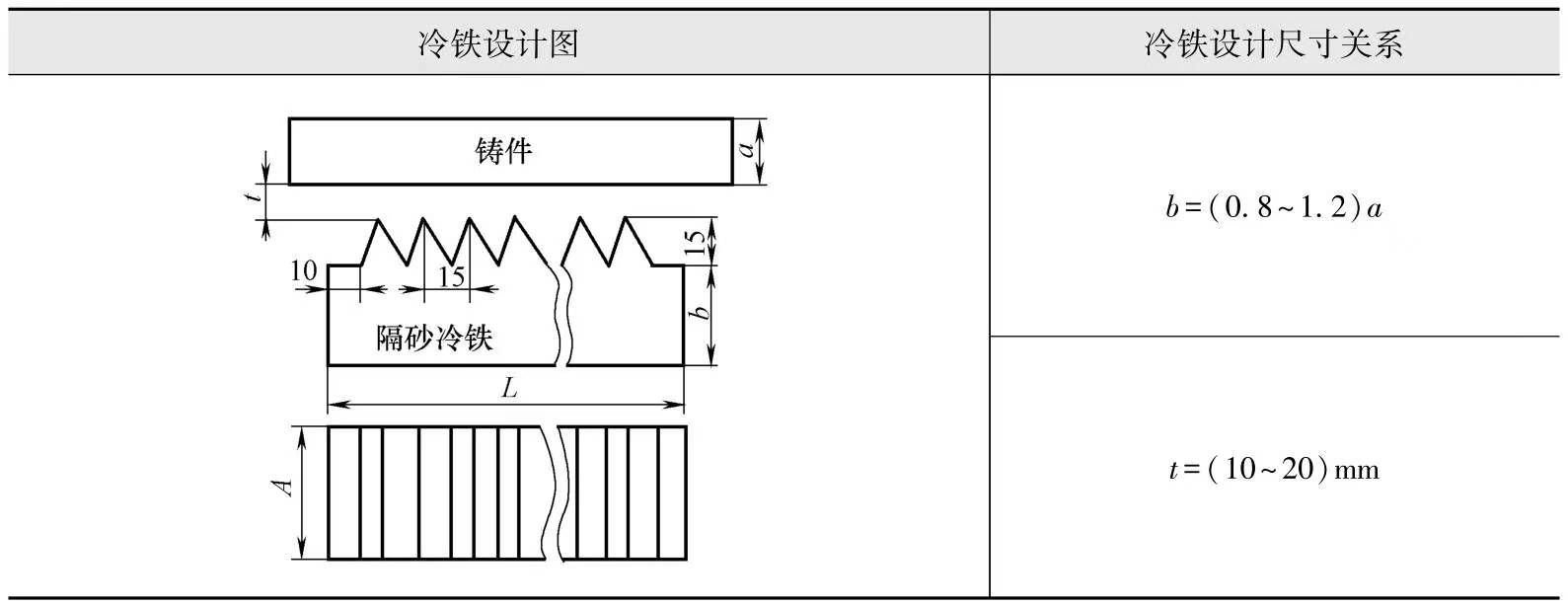 注:冷鐵的長(zhǎng)度L和寬度A設(shè)計(jì)同鑄鐵直冷外冷鐵的設(shè)計(jì),冷鐵的鋪設(shè)間距為15~20mm。